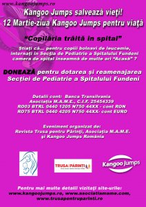 Sambata, 12 martie 2011, Kangoo Jumps si Trusa pentru Parinti au placerea sa va invite la „Ziua Kangoo Jumps pentru viata” in salile de sport din toata tara. Evenimentul este destinat proiectului “Copilaria traita in spital- Reamenajarea si dotarea Sectiei de Pediatrie din Institutul Clinic Fundeni” demarat de Asociatia M.A.M.E. (www.asociatiamame.com)