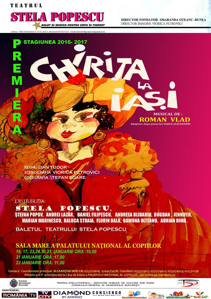 Bucureşti, 10 ianuarie 2017 - Luni, 16 ianuarie 2017, apoi în zilele de 17, 23, 24, 30, 31ianuarie - ora 10:00, 21 ianuarie ora 17:00, 22 ianuarie ora 11:00 - Sala Mare a Palatului Naţional al Copiilor invită publicul la primul eveniment al anului de la Teatrul Stela Popescu: musicalul CHIRIŢA LA IAŞI de Roman Vlad. Un spectacol inspirat de piesa lui Vasile Alecsandri, în regia lui Dan Tudor, cu participarea Stelei Popescu în rolul principal, alături de Daniel Filipescu, Andrei Lazăr, Andreea Blidariu, Ştefan Popov, Bogdan, Jennifer, Marian Marinescu şi alţi tineri actori. Musicalul propune o muzică originală, dar şi ecouri din pagini de Alexandru Flechtenmacher (autorul versiunii clasice a musicalului “Coana Chiriţa”), o mişcare scenică alertă, cu accent pe comicul de situaţie, dansuri de epocă elegante şi pline de vervă semnate Ştefan Soare şi lansate de Baletul Teatrului Stela Popescu, costume fastuoase, decoruri sugestive compuse de Viorica Petrovici.