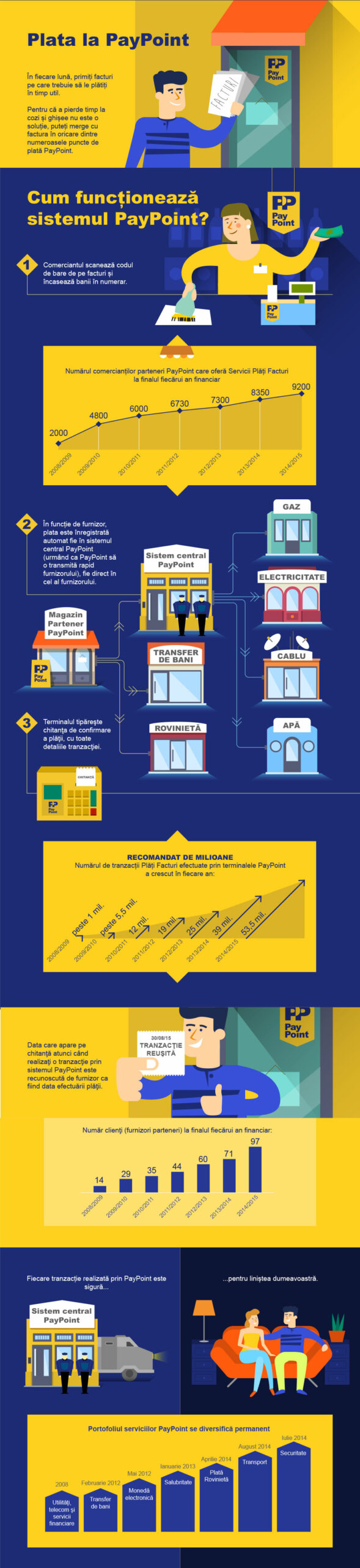 De-a lungul timpului, PayPoint a avut o evolutie spectaculoasa in Romania pe toate ariile de interes (retea, furnizori parteneri, tranzactii). De la lansarea din 2008, numarul magazinelor partenere a crescut cu 360% (de la 2.000, la peste 9.200 in acest moment), serviciile fiind disponibile in supermarket-uri, minimarket-uri, magazine mixte cu program de lucru prelungit din toata tara. Si numarul de plati efectuate prin terminalele PayPoint a crescut in fiecare an financiar, de la peste 1 milion de tranzactii plati facturi in 2008/2009, pana la 53,5 milioane in 2014/2015.