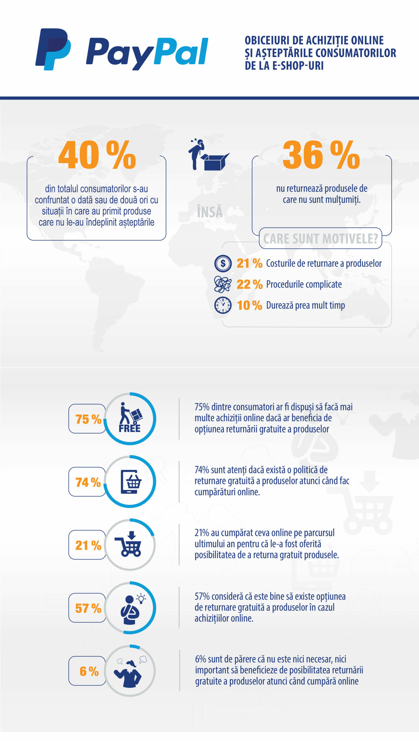 - consumatorii nu numai ca au adoptat acest mod de a face cumparaturi, insa stiu cum sa obtina maximul de beneficii de pe urma lui. De aceea, nu trebuie sa reprezinte o surpriza faptul ca persoanele care fac achizitii online se asteapta la standarde care sa opereze global. Potrivit studiului, comertul electronic are un potential extraordinar de crestere din moment ce consumatorii ar fi dispusi sa cumpere online mult mai mult daca nu ar fi preocupati nu de achizitia online a produsului in sine, ci de posibilitatea de a-l returna sau nu. De aceea, modificarea acestei abordari si sporirea increderii consumatorilor in ceea ce priveste achizitiile online se afla la baza protectiei pentru consumatori oferita de PayPal, extinsa acum prin intermediul PayPal Refunded Returns.