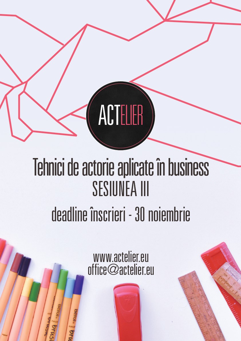 Actelier este singurul curs din Romania care preia exercitii din pregatirea unui actor profesionist pentru a facilita adaptarea mai rapida la provocarile comunicarii din mediul business. Workshop-ul a fost conceput ca un antrenament de 12 sedinte, in urma caruia cursantii vor dobandi abilitati de comunicare, persuasiune si negociere, isi vor spori imaginatia, creativitatea si increderea in sine si vor invata cum sa actioneze sub presiune, in situatii de criza.