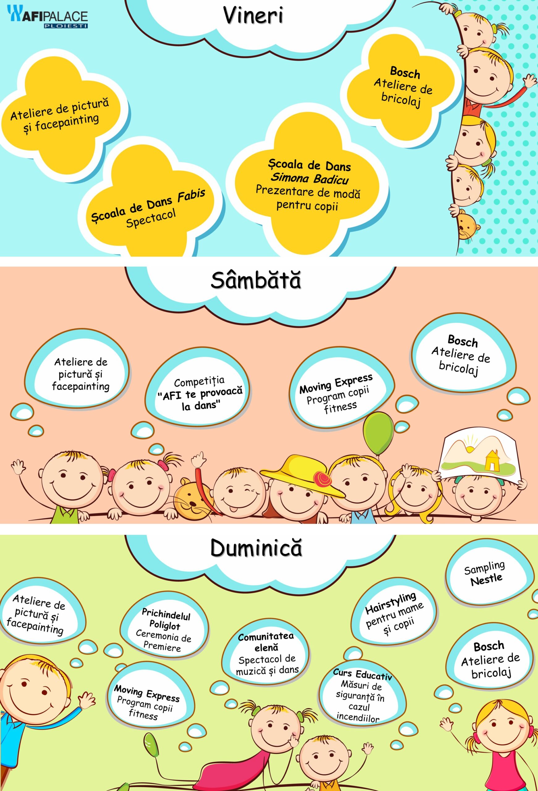 AFI Palace Ploiesti se va transforma timp de trei zile in universul copiilor, in care cei mici se vor putea bucura de competitii si spectacole de dans, ateliere de pictura, bricolaj, prezentari de moda, ateliere educative, concursuri si alte surprize.