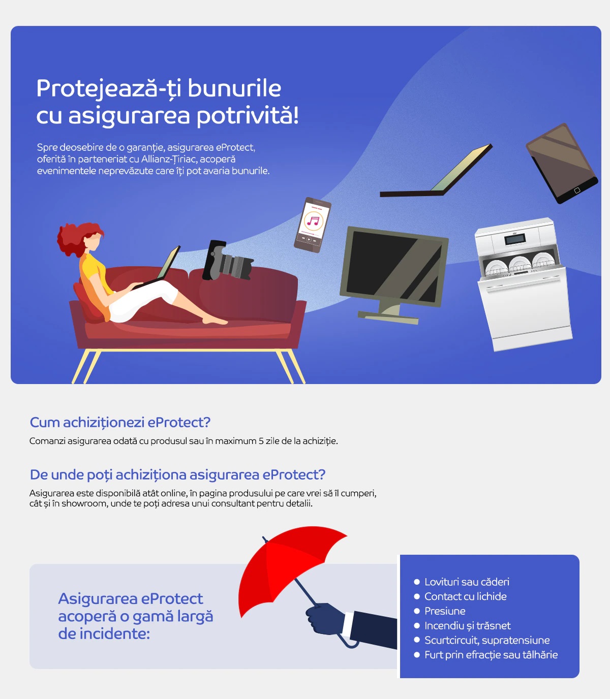 Pe lângă companiile de telefonie sau asigurări, și marii comercianți acordă acum asigurări pentru produse. De exemplu, dacă ai achiziționat un telefon de la eMAG, poți opta pentru asigurare telefon eProtect. Prin eProtect poți asigura mai multe tipuri de electronice și electrocasnice. Serviciul a fost creat în parteneriat cu Allianz-Țiriac și este disponibilă pentru produsele vândute de către eMAG. Dacă vreodată telefonul tău va veni în contact cu lichide, va suferi lovituri sau căderi, presiune, va face un scurtcircuit sau o supratensiune, va arde într-un incendiu, va interfera cu un câmp electromagnetic, va fi lovit de fulger sau va fi furat, această asigurare telefon te asigură că nu va trebui să investești într-un telefon nou. Suma asigurată este, de obicei, reprezentată de valoarea bunului la momentul achiziției. Dacă returnezi produsul, polița este reziliată. În cazul în care dorești să renunți la poliță, dar fără a returna produsul, poți face acest lucru în 30 de zile (60 de zile pentru clienți Genius), iar banii pentru prima de asigurare îți vor fi integral returnați. Dacă renunți după această perioadă, îți va fi returnată prima de asigurare, dar mai puțin valoarea aferentă perioadei de asigurare a bunului, până la momentul deciziei de reziliere.