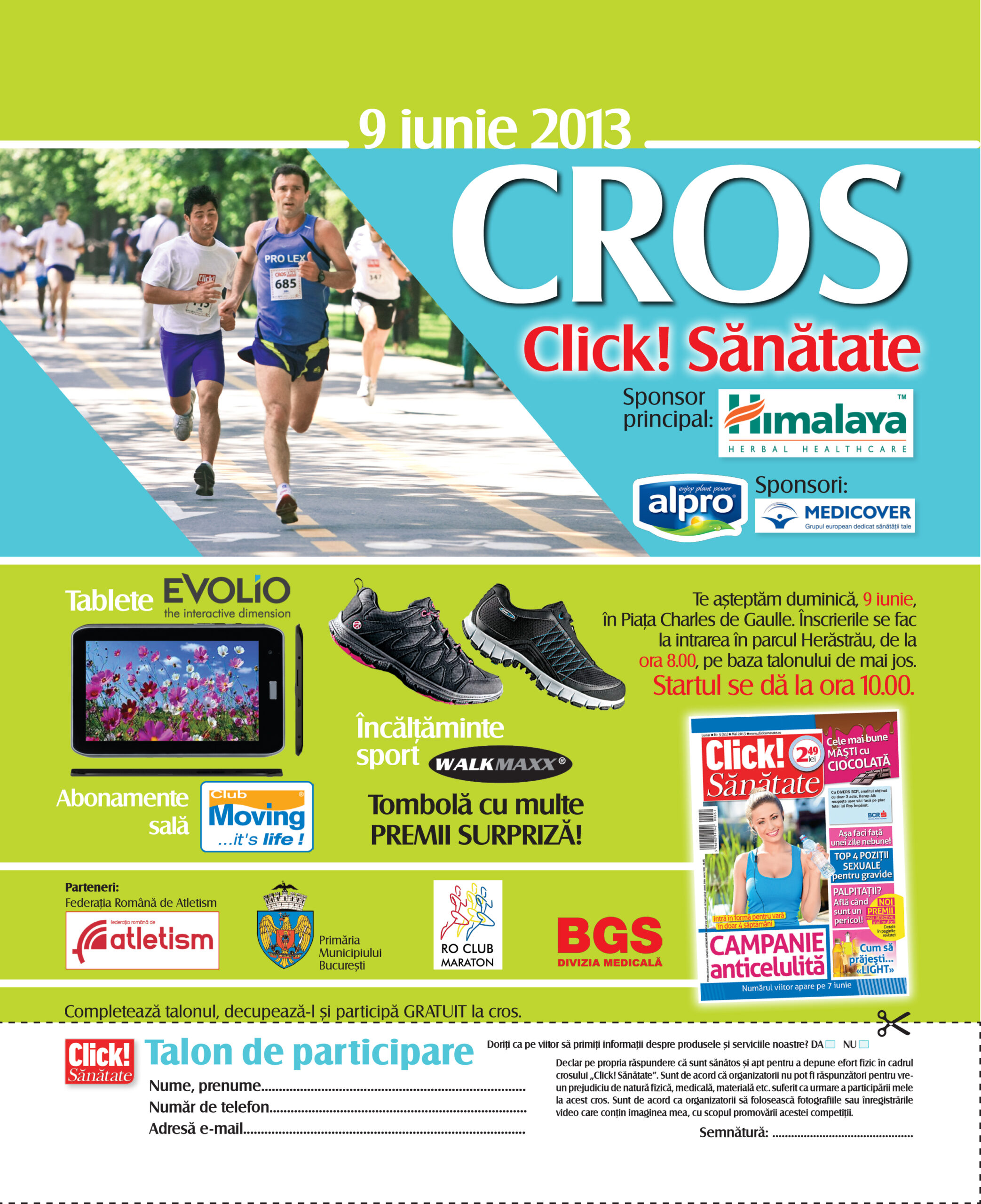 Inscrierile la cros se fac in ziua evenimentului, la intrarea in parcul Herastrau , intre 8:00 si 9:50 doar cu talonul din revista Click. Cursa dureaza o ora, intre 10 si 11, iar pentru a preveni orice incidente vor fi acolo agenti de securitate BGS si un echipaj medical BGS.