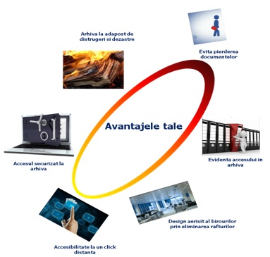 Arhiva electronica te ajuta sa gasesti imediat documentul cautat gratie sistemului de indexare a campurilor definitorii in baza de date cu documentele scanate, vei fi sigur ca intreaga arhiva este la adapost de uzura la care este supusa o arhiva fizica dar si de situatii catastrofale(incendii...).