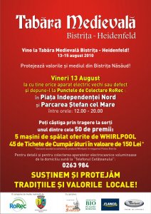 Toti deponentii de echipamente electrice uzate sau stricate vor participa la o tombola la care pot castiga, prin tragere la sorti, unul dintre cele 50 de premii puse in joc de organizatori. Premiile constau in 5 masini de spalat Whirlpool si 45 de tichete de cumparaturi in valoare de 150 de RON. Tichetele vor putea fi utilizate pentru achizitionarea oricarui produs nou din gama Whirlpool, in perioada 16 august-30 septembrie 2010, in magazinul Flanco Bistrita.Tragerea la sorti a castigatorilor va avea loc duminica 15 august, pe scena Taberei medievale de la Heidenfeld, in jurul orei 21,00.