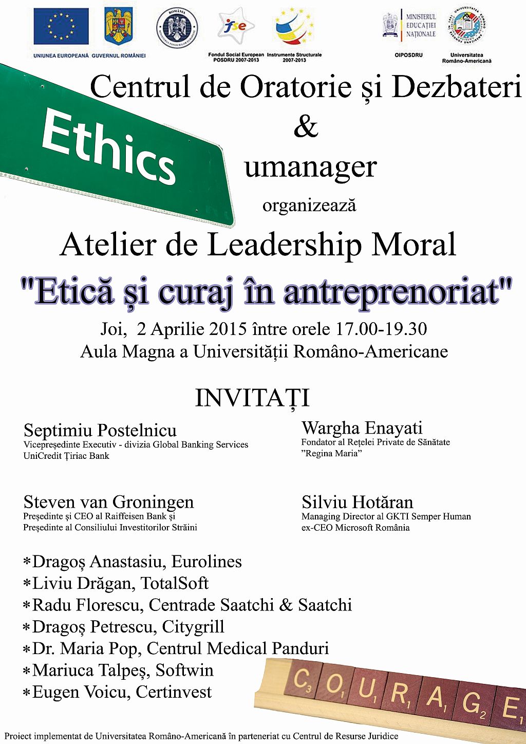 Centrul de Oratorie si Dezbateri ( h t t p : / / o r a to r i e . r a u . r o ) din cadrul Universitatii Romano-Americane, in parteneriat cu Umanager, organizeaza un atelier de leadership moral institulat "Etica si curaj in antreprenoriat".