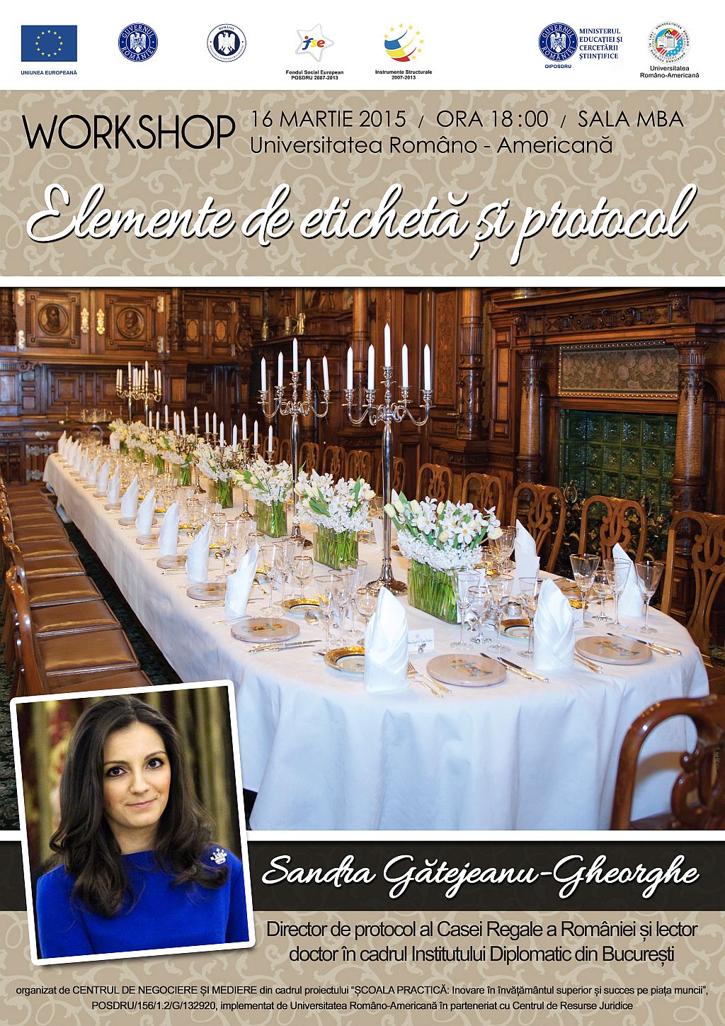 Centrul de Negociere si Mediere ( h t t p : / / c n m . r a u . r o ) din cadrul Universitatii Romano-Americane te invita sa participi in data de 16 martie 2015 la workshopul "Elemente de eticheta si protocol".