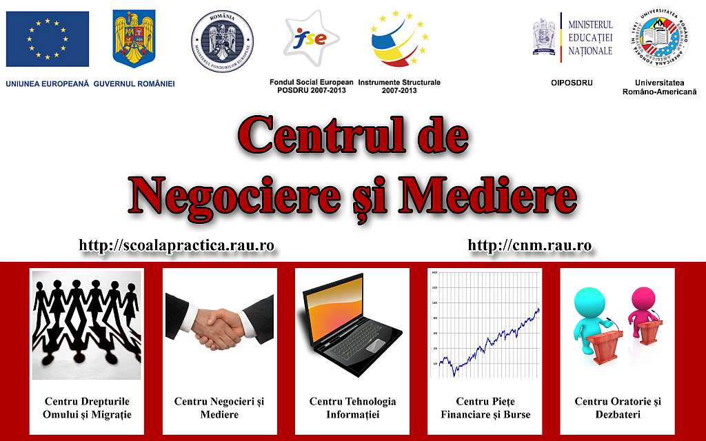 Evenimentul este organizat in cadrul proiectului "SCOALA PRACTICA: Inovare in invatamantul superior si succes pe piata muncii", POSDRU/156/1.2/G/132920, implementat de Universitatea Romano-Americana in colaborare cu Centrul de Resurse Juridice.