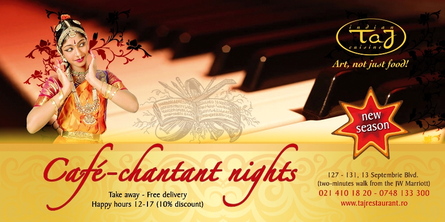 Restaurant Taj reprezinta de 10 ani sofisticata bucatarie indiana in Bucuresti, 10 ani de arome si ritmuri exotice, castigand numai in ultimii ani titlul de "Cel mai bun restaurant indian din Bucuresti", decernat în cadrul concursului Eating & Drinking Awards. Mai mult, în 2010 restaurantul Taj a castigat si premiul de “Cel mai popular restaurant din Bucureşti”.