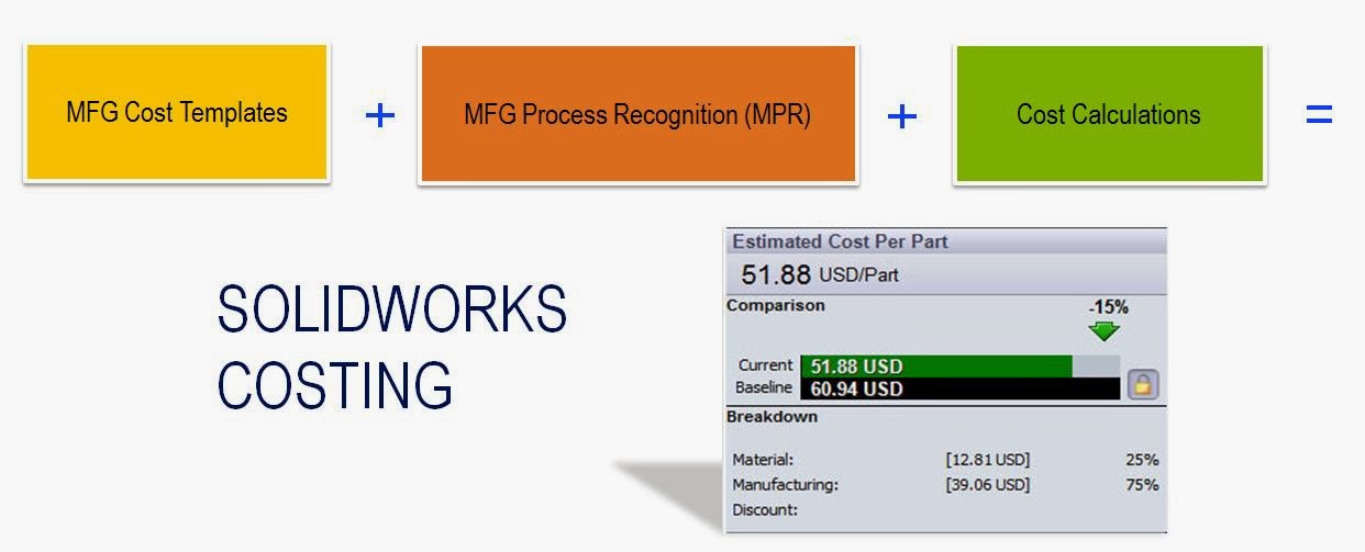 Cu SolidWorks Costing estimaţi automat costurile de execuţie folosind șabloane (templates) predefinite; proiectanţii pot lua mai rapid decizii corecte, și în cunoștinţă de cauză vis-a-vis de cost; clienţii își pot automatiza sistemele de ofertare. Personalizaţi template-uri pentru a introduce date și costuri specifice de execuţie, cum ar fi materialele, costul cu forţa de muncă, regimuri de lucru ale mașinilor.