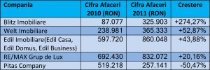 Analizand datele din topul prezentat in articolul la care facem referire, dorim sa aducem cateva completari, in ceea ce priveste compania Blitz Imobiliare. Cifra de afaceri neta inregistrata de Blitz Imobiliare in 2010 a fost de 87.077 lei, iar in 2011, cifra de afaceri inregistrata a fost de 325.903 lei, conform datelor de pe site-ul Ministerului de Finante(www.mfinante.ro). Astfel, cresterea inregistrata de Blitz Imobiliare in al doilea an de activitate a fost de 274,27%, procent care o plaseaza categoric pe prima pozitie in topul cresterilor!