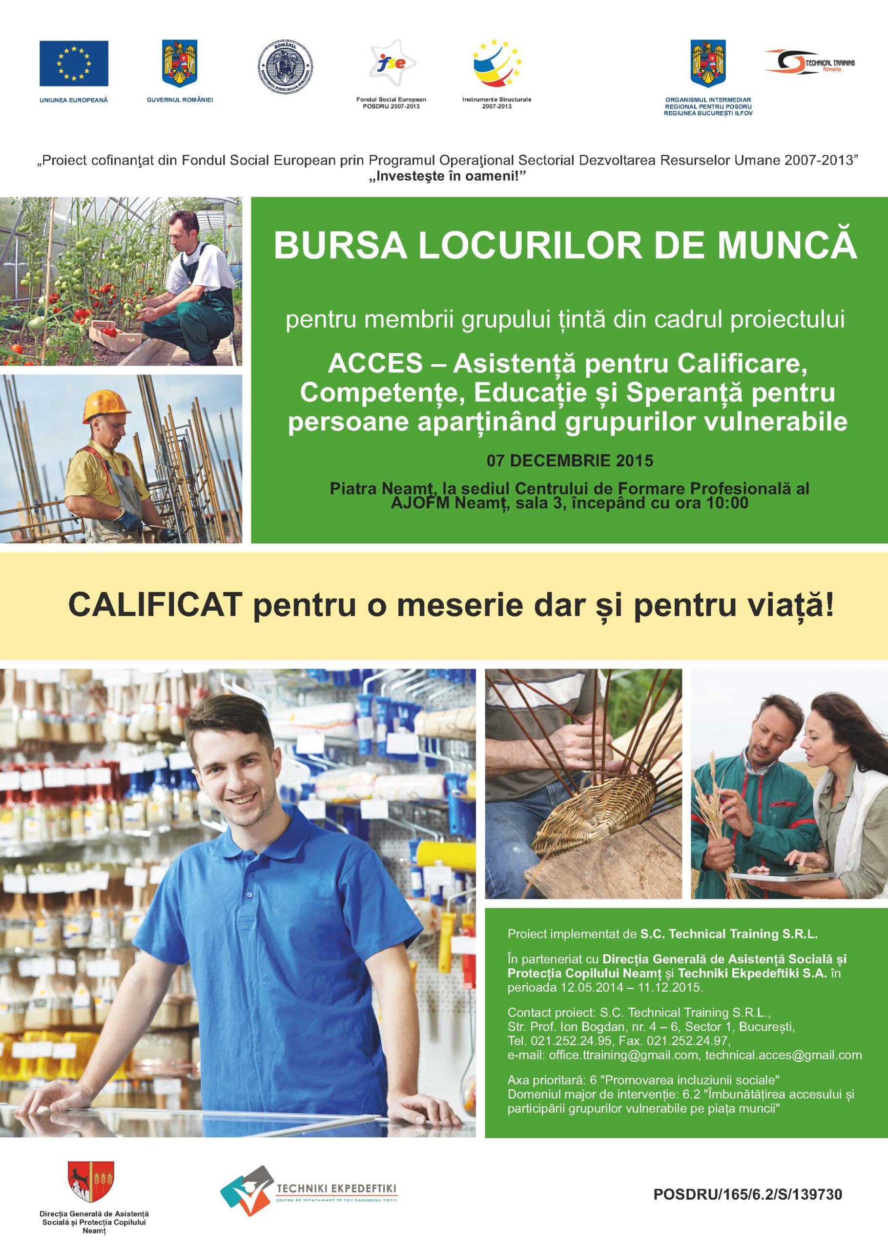 Proiectul ACCES – Asistență pentru Calificare, Competențe, Educație și Speranță pentru persoane aparținând grupurilor vulnerabile - POSDRU/165/6.2/S/139730, se înscrie pe Axa prioritară 6 ”Promovarea incluziunii sociale”, Domeniul major de intervenție: 6.2 ”Îmbunătățirea accesului și participării grupurilor vulnerabile pe piața muncii” și se derulează în perioada 12 mai 2014 – 11 decembrie 2015.
