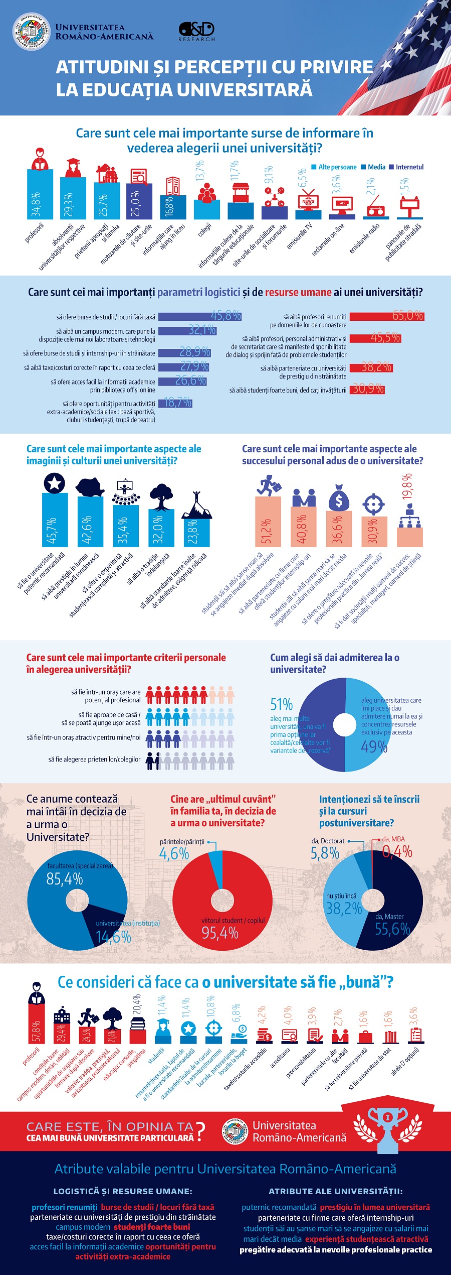 D&D Research a lansat, la iniţiativa Universităţii Româno - Americane, cel mai recent raport de cercetare din România ce măsoară percepţiile, nevoile, atitudinile şi elementele decizionale privind învăţământul superior. Cercetarea a relevat faptul că tinerii şi părinţii din România consideră că Universitatea Româno - Americană este cea mai bună instituţie privată de învăţământ superior din ţară.