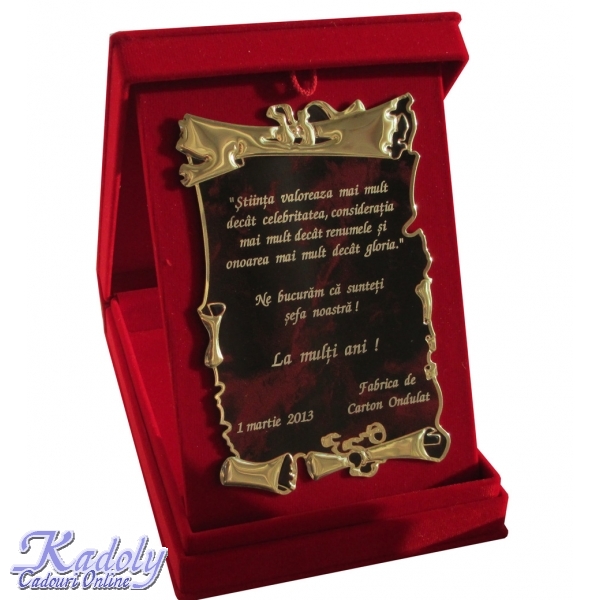 Cadou pentru ziua ei- este un cadou deosebit format dintr-o placheta gravata cu un mesaj deosebit pentru mama, sotia, iubita, fiica dumneavoastra. Placheta este asezata intr-o frumoasa cutie din catifea rosie. In maxim 2 zile lucratoare veti beneficia de personalizarea acestui minunat cadou.