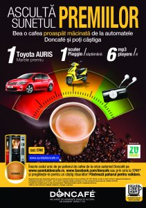 In perioada 1 octombrie – 30 noiembrie, la fiecare cafea proaspat macinata cumparata de la automatele Doncafe poți castiga 6 mp3 playere pe zi si un scuter Piaggio pe saptamana. La finalul campaniei, va fi extras castigatorul marelui premiu, o masina Toyota Auris. Inscrie codul unic de pe paharele de cafea de la orice automat Doncafe pe www.sunetuldoncafe.ro, www.facebook.com/Doncafe sau trimite-l prin SMS la 1741 si pregateste-te de castig.