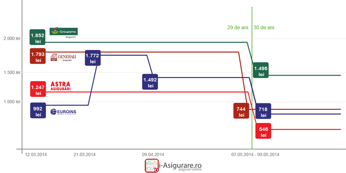 Pentru exemplificare, am ales o persoana cu varsta de 29 ani, ce urmeaza sa implineasca 30 de ani la sfarsitul lunii mai, cu domiciliul in Bucuresti. Este posesoare a unei masini Mercedes, ce are capacitatea cilindrica de 2148 cm3 si o putere de 90 kW, cu istoric pozitiv, fara daune – o clasa de bonus B9. Am urmarit evolutia preturilor RCA in intervalul 12 martie 2014 – 14 mai 2014. De ce 29 si nu 24 de ani? Pentru ca diferentele de pret sunt considerabile. De asemenea, exista situatii in care preturile fluctueaza in lunile predecesoare implinirii varstei de 30 de ani. Practic, varsta de 30 de ani reprezinta un element cheie in calcului asigurarii.