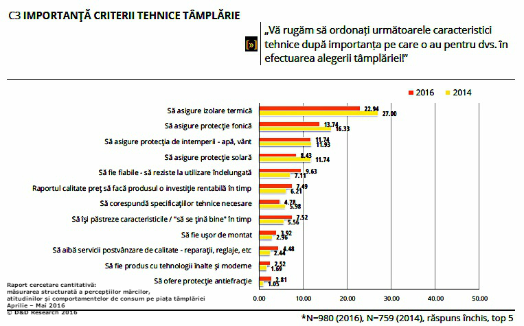 De cealaltă parte, însă, două criterii tehnice ale produsului se află pe un trend descendent în rândul cumpărătorilor. Dacă în urmă cu doi ani, 27% dintre români erau interesați de izolarea termică pe care o oferă produsele PVC, în 2016 doar 22,94% dintre cumpărători mai sunt interesați de acest aspect. Tot în scădere este și interesul cumpărătorilor pentru protecția fonică oferită de tâmplăria PVC, de la 16,33% în 2014 la 13,74% anul acesta.