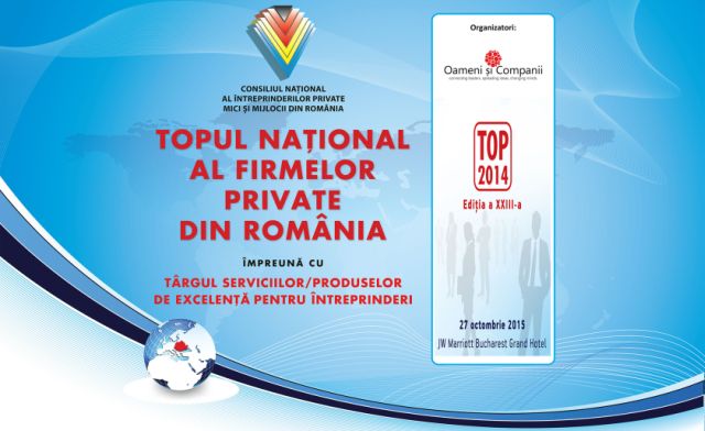 Potrivit tradiţiei de 22 de ani, Consiliul Naţional al Întreprinderilor Private Mici şi Mijlocii din România în parteneriat cu inisterul Energiei, Întreprinderilor Mici și Mijlocii și Mediului de Afaceri ,organizează şi în acest an “Topul Naţional al Firmelor Private din România – Top 2014”, în data de 27 octombrie 2015, începând cu ora 9:00, la JW Marriott Bucharest Grand Hotel  (Grand Ballroom). Pentru prima dată, în acest an, concomitent cu Top-ul va fi organizat şi “TÂRGUL SERVICIILOR/PRODUSELOR DE EXCELENŢĂ PENTRU ÎNTREPRINDERI” (Constanţa Ballroom) la care întreprinzătorii vor avea posibilitatea participării cu un stand de prezentare şi promovare a produselor şi serviciilor lor.