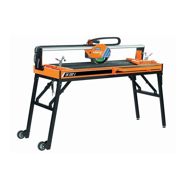 Referindu-ne tot la modelul de masa de taiat gresie si faianta TR 232 L de la Norton Clipper, trebuie sa subliniem si alte detalii foarte utile, care demonstreaza performanta in utilizare. Capul este reglabil, sina de ghidaj este de mare rezistenta, produsul incorporeaza extensie laterala. Este prevazut cu manere, picioare si roti pliabile. Se remarca ghidajul de taiere cu reglaj unghiular, bancul acoperit cu cauciuc si cleme. Datorita caracteristicilor sale, se permite taierea materialelor mari sau / si late.