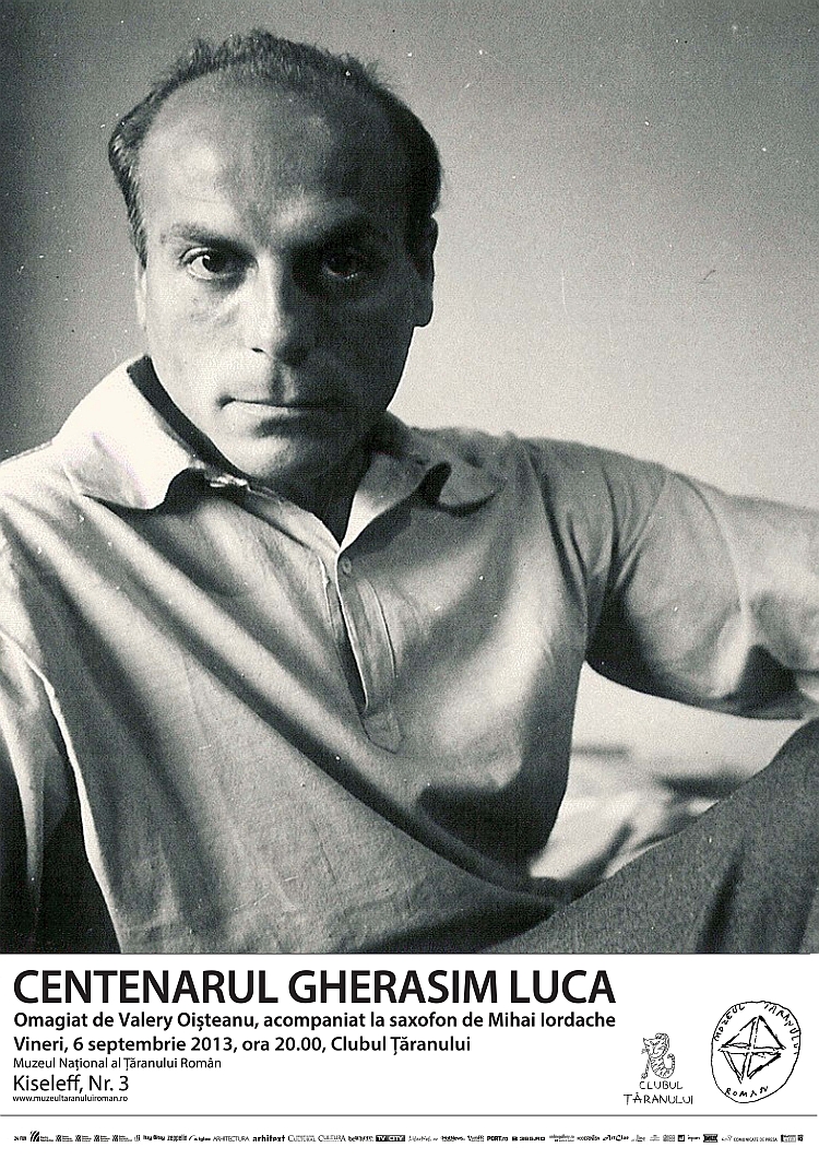 CENTENAR GHERASIM LUCA Omagiat de poetul Valery Oișteanu Vineri 6 septembrie 2013 ora 20 Clubul Țaranului