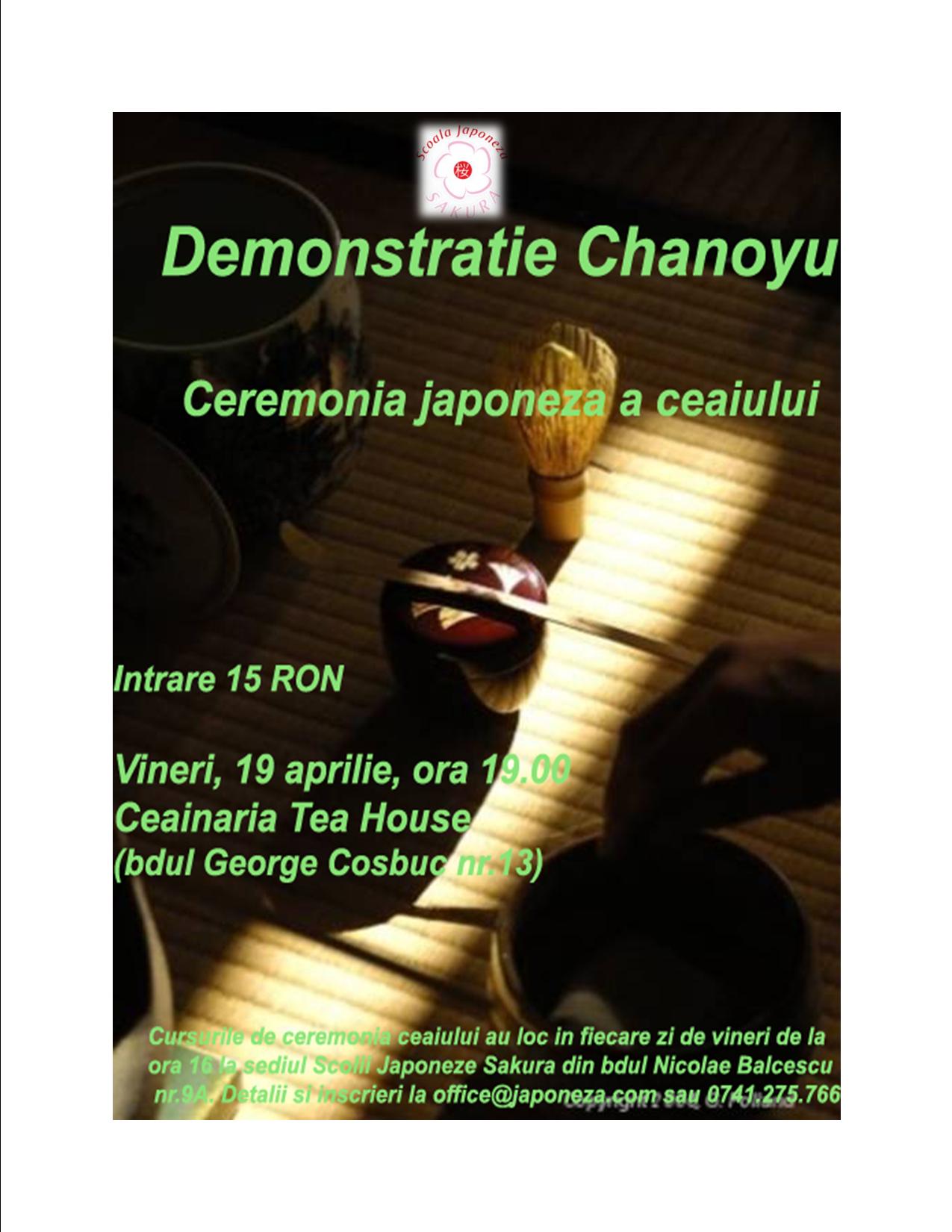 Va invitam la un eveniment mult asteptat de noi..ceremonia ceaiului Chanoyu,vineri,19 aprilie incepand cu ora 19.00.Inscrieri la tel.0721674578/0213351517/0734146895
