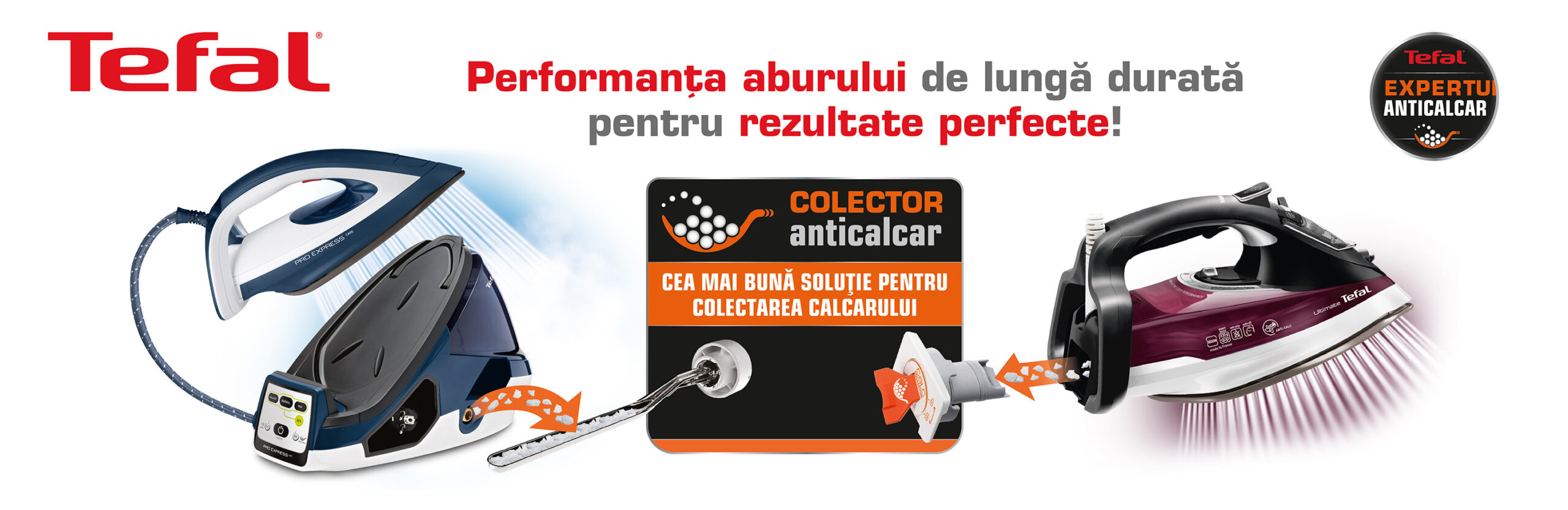 Una dintre cele mai frecvente situații care te împiedică să ai o sesiune de călcat plăcută și care poate afecta chiar și țesăturile, o reprezintă depunerile de calcar. Dacă până acum obișnuiai să utilizezi diverse soluții de curățare, Tefal vine în ajutor cu o inovație simplă și eficientă, care te scapă de probleme și asigură o performanță de lungă durată a aburului: colectorul anticalcar, un sistem disponibil pe o gamă largă de stații și fiare de călcat Tefal.