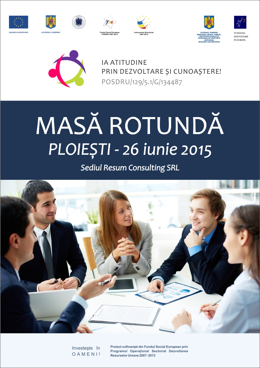 Pe data de 26.06.2015, orele 12.00, va avea loc la sediul pus la dispozitie de Partida Romilor “Pro-Europa”, Strada Gheorghe Grigore Cantacuzino, nr.115-117, cladirea C1, etaj 2, localitatea Ploiesti - Judetul Prahova, MASA ROTUNDA pe tematicile: modalitati de acces pe piata muncii, facilitati pentru accesul la diferite masuri active, beneficiile si oportunitatile de orientare si formare profesionala oferite de proiect.