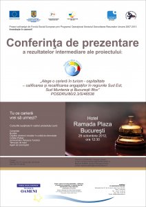 Joi, 25 Octombrie 2012, a avut loc la Bucureşti, Hotel Ramada Plaza, conferinţa intermediară a proiectului „Alege o carieră în turism-ospitalitate – calificarea și recalificarea angajaților în regiunile Sud Est, Sud Muntenia și București Ilfov”