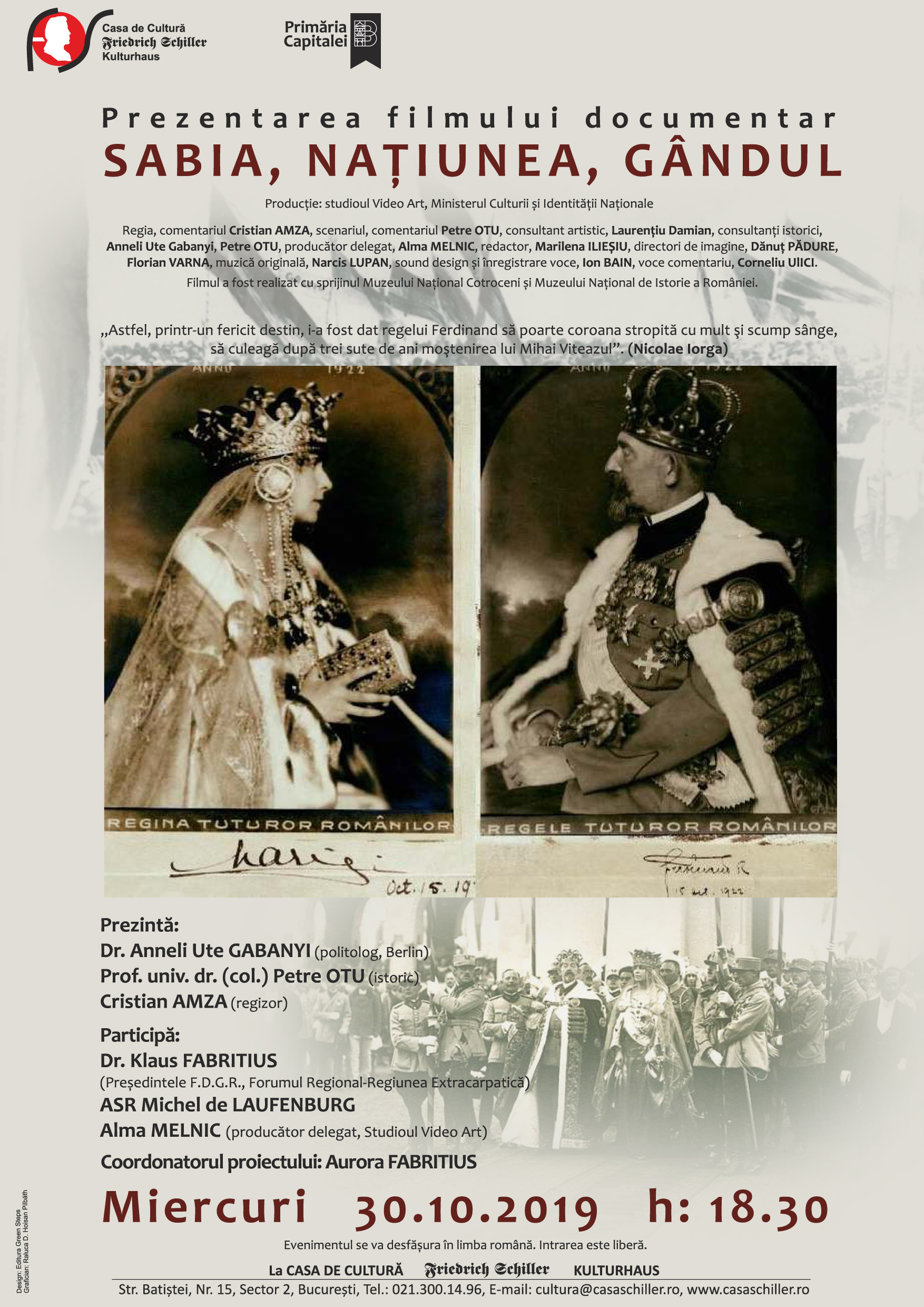 În cadrul evenimentelor dedicate Primului Război Mondial, Centenarului Marii Uniri de la 1918 și recunoașterii internaționale la Conferința de Pace de la Paris (1919), Casa de Cultură „Friedrich Schiller” vă invită miercuri, 30 octombrie 2019, ora 18.30, la premiera filmului documentar Sabia, Națiunea, Gândul, realizat de regizorul Cristian Amza. Filmul este o producție […]