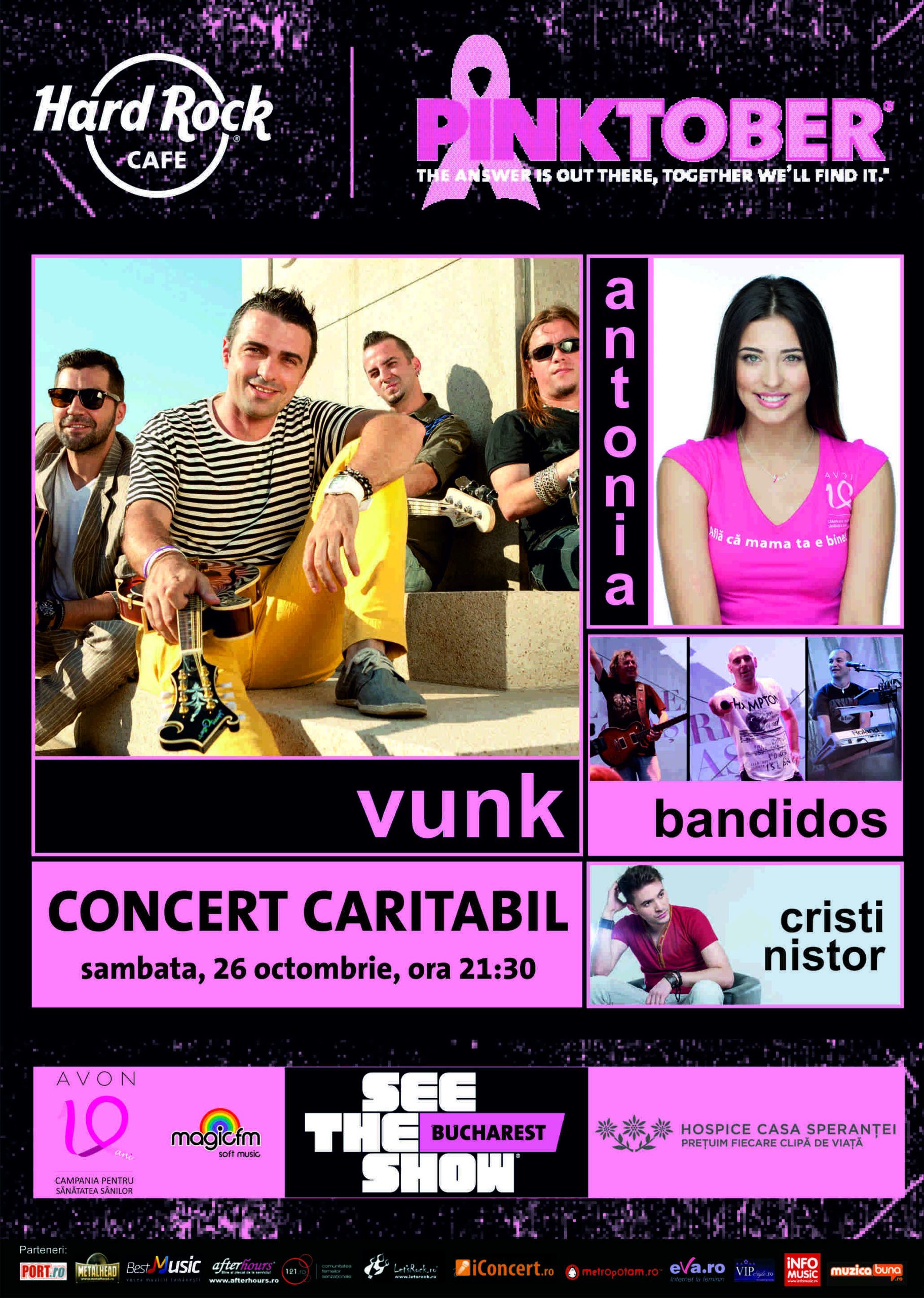La Hard Rock Cafe, luna octombrie inseamna mai mult decat distractie! Intr-o singura seara, muzica de calitate si frenezia de pe ringul de dans pot schimba soarta miilor de pacienti care vor putea, multumita tie, sa aiba acces la primul centru HOSPICE din Bucuresti, cu servicii medicale complete si gratuite. Asa ca, pe 26 octombrie, de la ora 21:30, nu poti lipsi de la un super concert live alaturi de sustinatorii campaniei Pinktober de anul acesta – trupa Vunk, Antonia, Cristi Nistor si Bandidos!