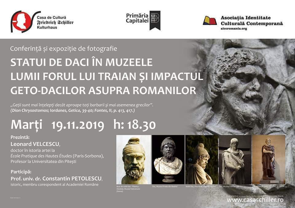 În cadrul tradiției prezentărilor istoriei României, Casa de Cultură „Friedrich Schiller” și Primăria Municipiului București vă invită marți, 19 noiembrie 2019, ora 18.30, la conferința și prezentarea expoziției „Statui de daci în muzeele lumii. Forul lui Traian și impactul geto-dacilor asupra romanilor”. Evenimentul este organizat în parteneriat cu Asociația Identitate Culturală Contemporană.