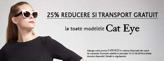 In perioada 15 iunie – 21 iunie 2016, pe Conga.ro poti achizitiona ochelari de soare stil Cat Eye la preturi reduse cu 25%. In plus, vei beneficia de transport gratuit.