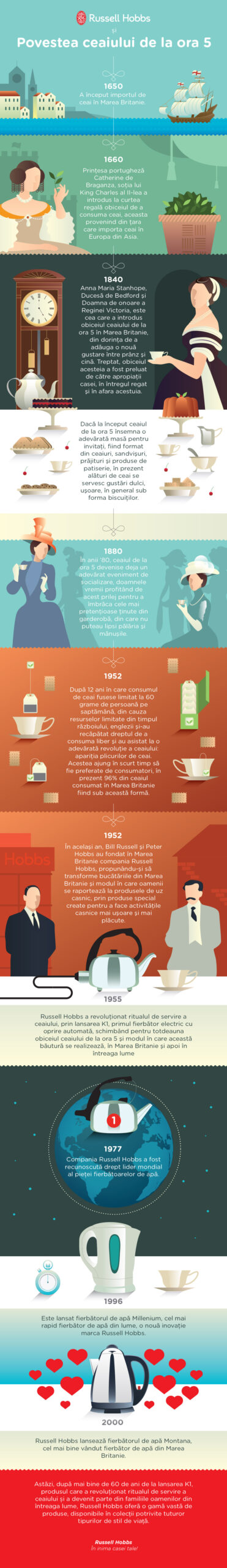 Pentru a sarbatori cei 60 de ani de inovatie in care a reusit sa devina un element nelipsit de la orice intalnire care are in centru ceaiul, Russell Hobbs lanseaza un infografic care prezinta cele mai importante momente din istoria ceaiului de la ora 5 si modul in care brandul a reinventat acest prilej de socializare.