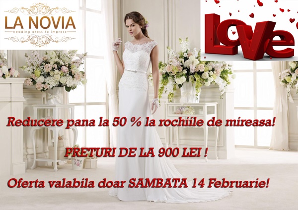Salonul La Novia, din Bucuresti, te asteapta cu peste 50 de modele de rochii de mireasa la pret redus cu pana la 50%. Oferta valabila doar Sambata, 14 februarie 2015.