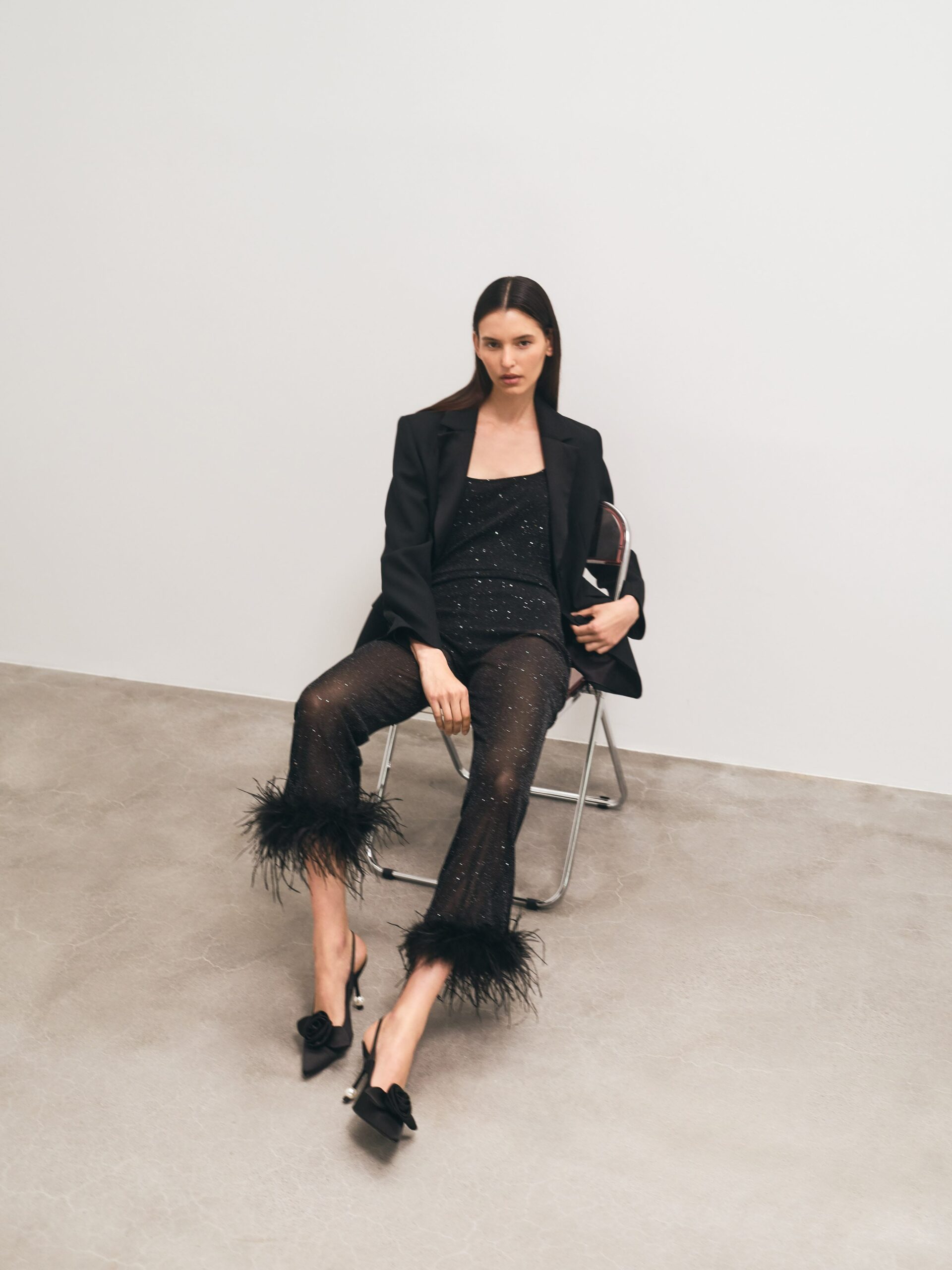 Designerii Reserved s-au concentrat pe articole clasice de party intr-o editie neconventionala, care poate fi introdusa si in stilul de zi cu zi, adaugand un pic de extravaganta. Colectia include, printre altele, o varianta a rochiei clasice slip, inclusiv un model din matase 100%, rochii cu paiete rosii si argintii si un top decorat cu un detaliu de trandafir. Exista si pene, de exemplu pe decolteul unei little black dress sau pe cracii unei salopete (detasabile), si franjuri cu un efect incredibil in stilul caleidoscop.