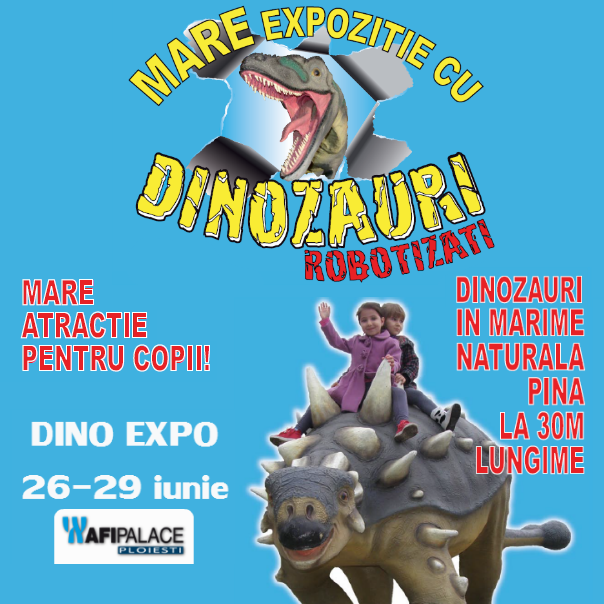 In perioada 26 – 29 iunie, AFI Palace Ploiesti va gazdui DinoExpo, cea mai mare expozitie de dinozauri robotizati in miscare. 30 de reproduceri ale unor dinozauri in marime naturala, de la stadiul de pui pana la maturitate, vor putea fi admirate incepand de astazi in parcarea AFI Palace Ploiesti.