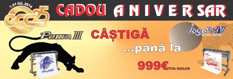 Cu ocazia aniversarii unui sfert de secol de activitate, producatorul taiwanez de echipamente de publicitate GCC, alaturi de Pin Group Romania, anunta o deosebita promotie. Valabila pana la finalul lunii IULIE 2014, aceasta se adreseaza celor care cauta un cutting plotter profesional - in program sunt incluse la ora actuale doua modele de astfel de aparate. Vezi aici detalii despre campania promovata de Pin Grup !