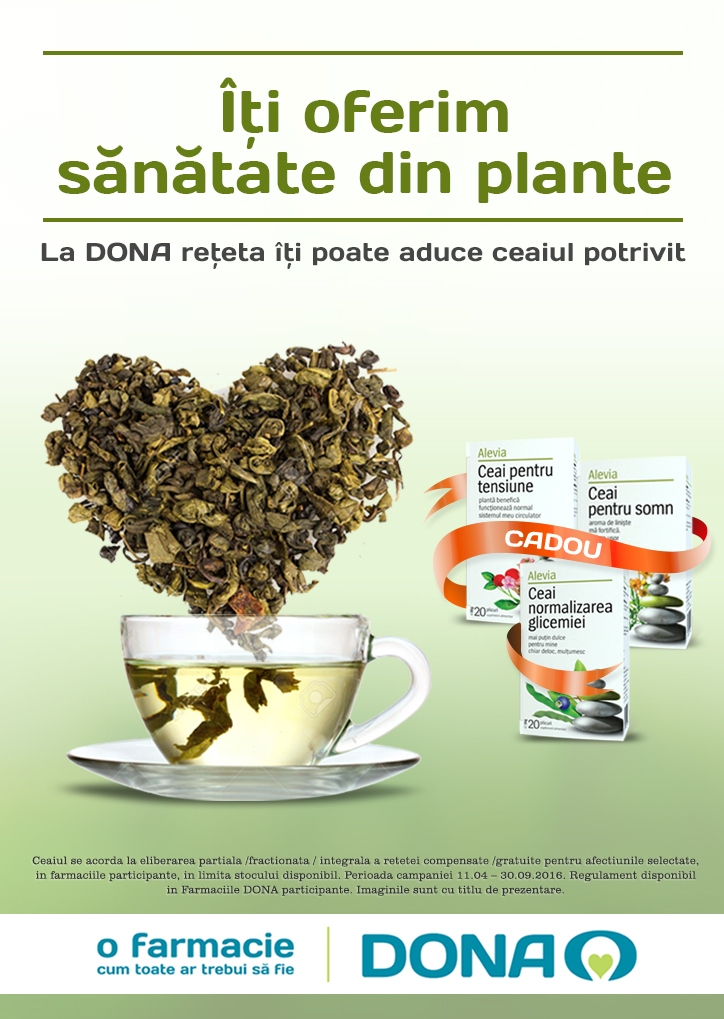 În perioada aprilie – septembrie 2016, rețeaua de farmacii DONA derulează campania „Sănătatea din plante”, dedicată persoanelor care suferă de afecțiuni cronice. Pacienții care își achiziționează tratamentul din farmaciile DONA participante, în baza rețetelor compensate sau gratuite prescrise pentru o arie variată de afecțiuni, vor primi cadou ceaiuri terapeutice, adaptate în funcție de nevoile lor medicale. Campania se va desfăşura în Farmaciile DONA din oraşele: Bucureşti, Cluj, Ploiești și Tecuci.