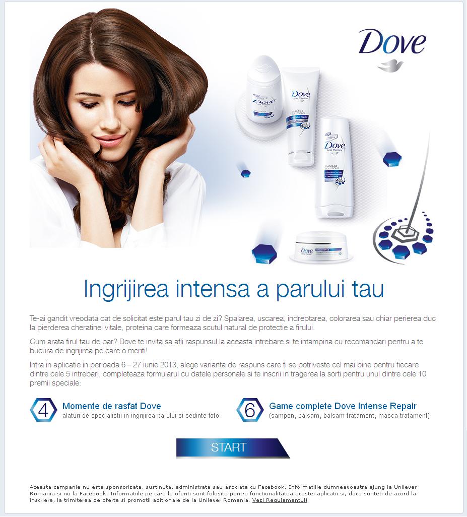 Dove a lansat o provocare fanelor Dove pe pagina de Facebook prin intermediul aplicatiei „Ingrijirea intensa a parului tau”. Astfel, aproximativ 6700 de femei si-au identificat micile slabiciuni din rutina zilnica de ingrijire a parului. In perioada 10 iunie – 11 iulie 2013, aplicatia a beneficiat de un mix de promovare prin intermediul unui tab dedicat pe pagina de Facebook Dove, Facebook Ads si comunicare online.