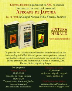 In perioada 10-11 iunie, editura Herald va invita la standul sau din incinta colegiului national Mihai Viteazul, pentru a descoperi arta, cultura si spiritualitatea nipona prin intermediul celor mai variate titluri din colectii precum : Carti fundamentale, Cultura si civilizatie, Zen, Daoism, Scrieri initiatice si Logos.