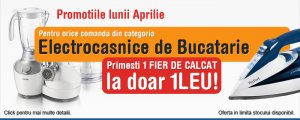 Pe toate acestea le poti comanda online sau in magazinele noastre din Bucuresti, beneficiind de super oferta acestei luni : la orice comanda care depaseste 100 de lei primiti un produs electrocasnic la 1 Leu !