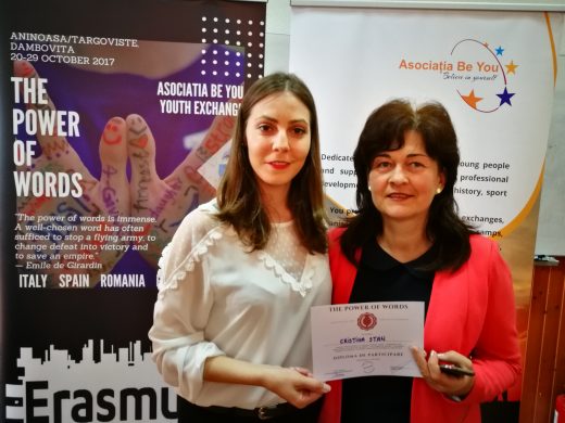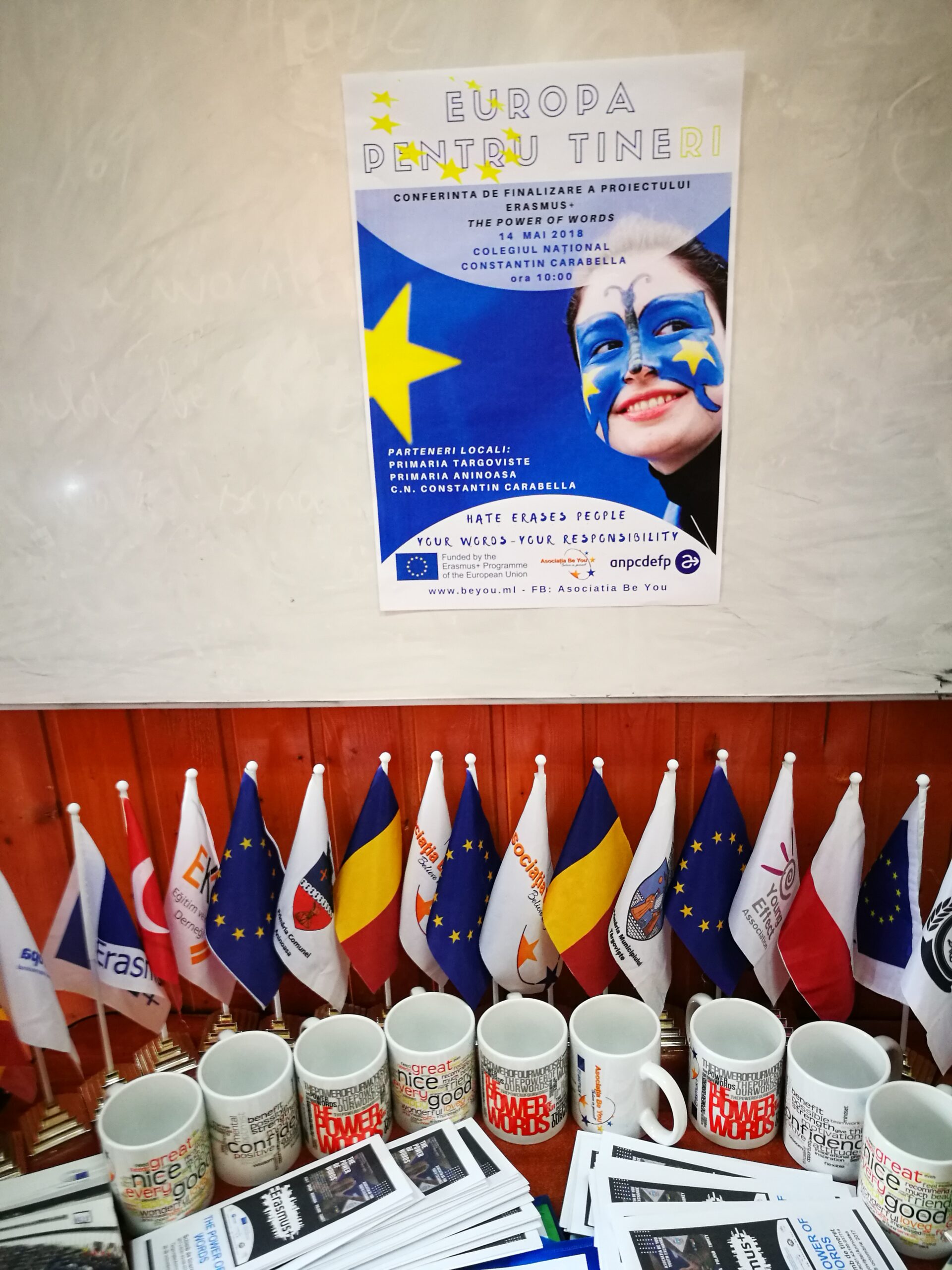 În data de 14 mai 2018 a avut loc ultimul eveniment din cadrul proiectului Erasmus+ “The Power of Words” coordonat de Asociația Be You și finanțat din fonduri UE, care s-a desfășurat printre tineri, acolo unde este locul său și al programului Erasmus+. Conferința de final a fost denumită sugestiv ”EUROPA PENTRU TINEri” și a fost găzduită de Colegiul Național Constantin Carabella din Târgoviște cu participarea elevilor, a cadrelor didactice și a conducerii instituției. Am ales să desfășuram conferința non-formal și a debutat cu o un joc de nume care a destins atmosfera, urmând o dicuție interactiva despre Uniunea Europeană unde am punctat evenimentele importante din istoria, prezentul și viitorul Uniunii Europene. În cadrul evenimentului am prezentat rezultatele și impactul proiectului “The Power of Words” prin vizionare de videoclipuri, campania împotriva DIU și poze din proiect, precum și obiectivele acestuia: