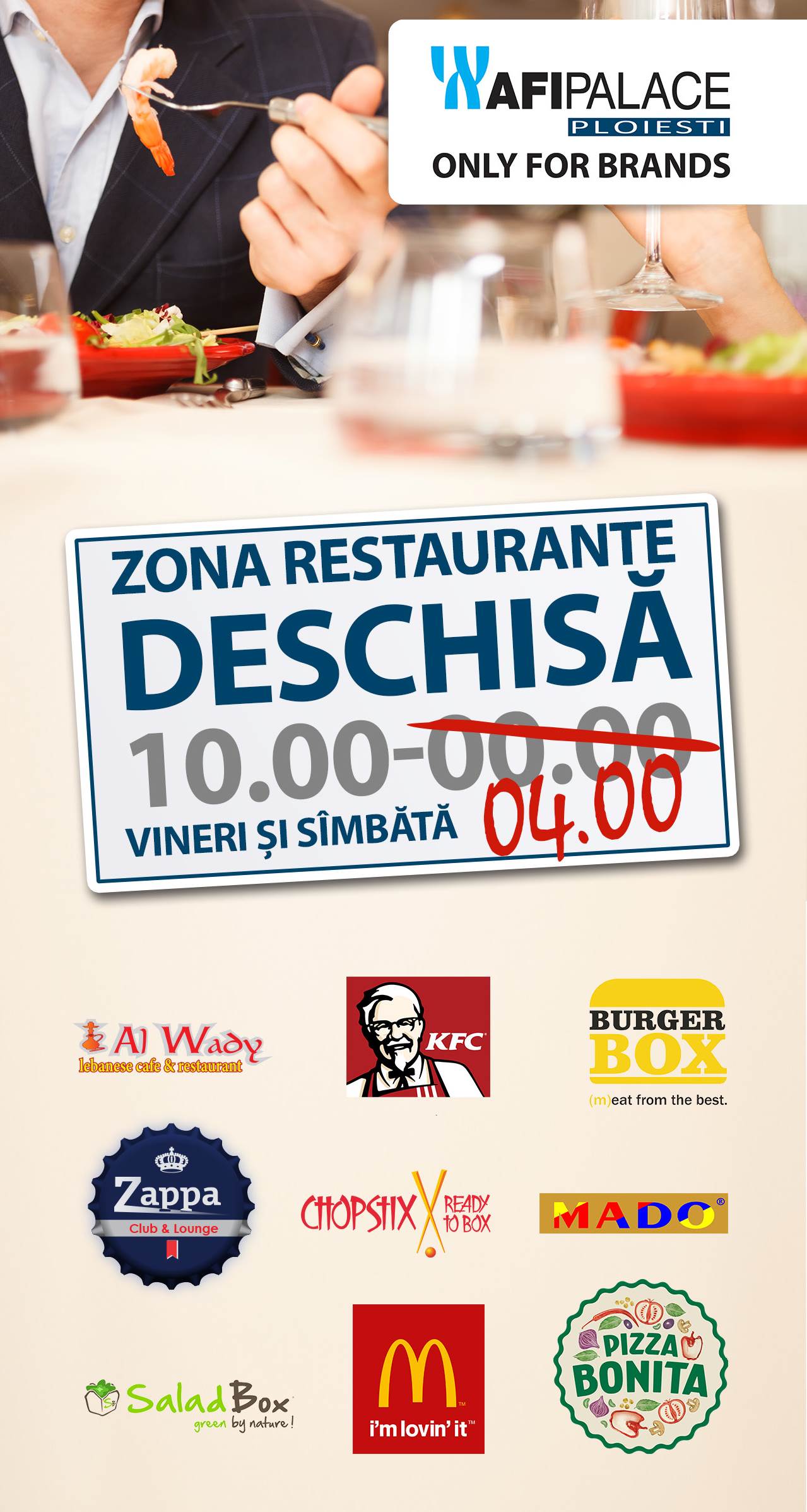 Restaurantele care si-au anuntat prelungirea programului pana la orele 4 dimineata in zilele de vineri si sambata sunt KFC, McDonald’s, Burger Box, Pizza Bonita, Al Wady, Salad Box, Mado si Chopstix.