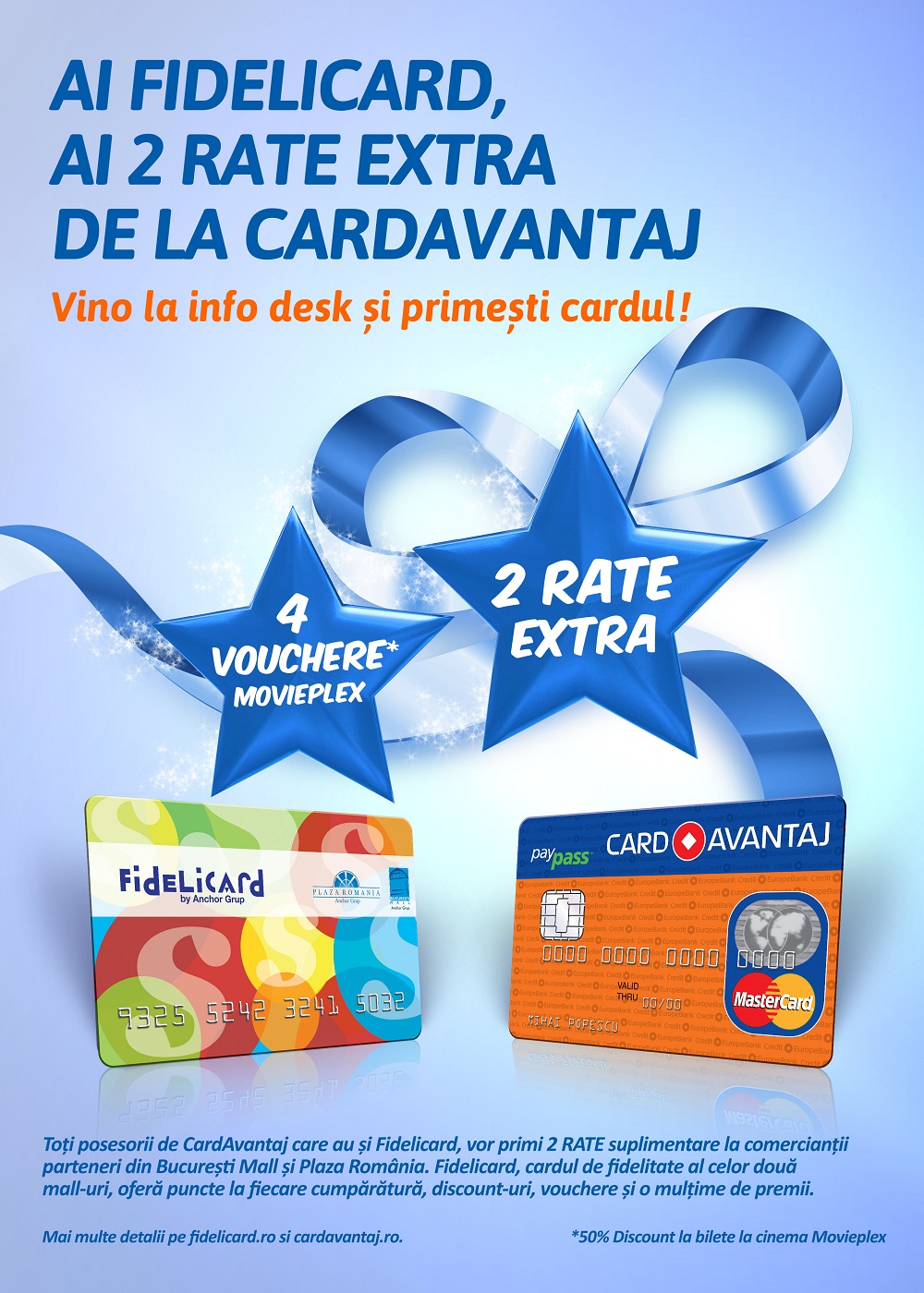 Mai mult, daca un posesor al unui CardAvantaj aplica online pentru Fidelicard, el va beneficia de patru bilete la Cinema Movieplex – aflat in incinta Plaza Romania – cu o reducere de 50%. Totodata, posesorii de Fidelicard care aplica pentru CardAvantaj vorfi exceptati dela plata comisionului de administrare cont curent in primul an si vor primi un bonus de 50 de lei la prima tranzactie, indiferent de valoarea ei.