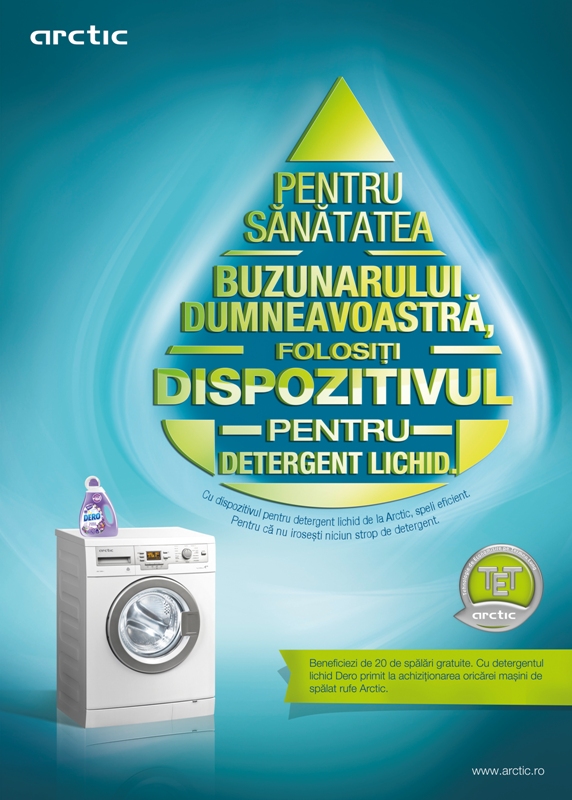 Arctic iti ofera acum ocazia de a ingloba toate beneficiile de mai sus, astfel incât la achizitionarea oricarei masini de spalat Arctic TET, primesti o sticla de detergent lichid Deropentru 20 de spalari. Promotia este valabila pâna la data de 15 noiembrie 2013 in toate magazinele de electrocasnice la nivel national. Pentru mai multe detalii, acceseaza site-ul Arctic.