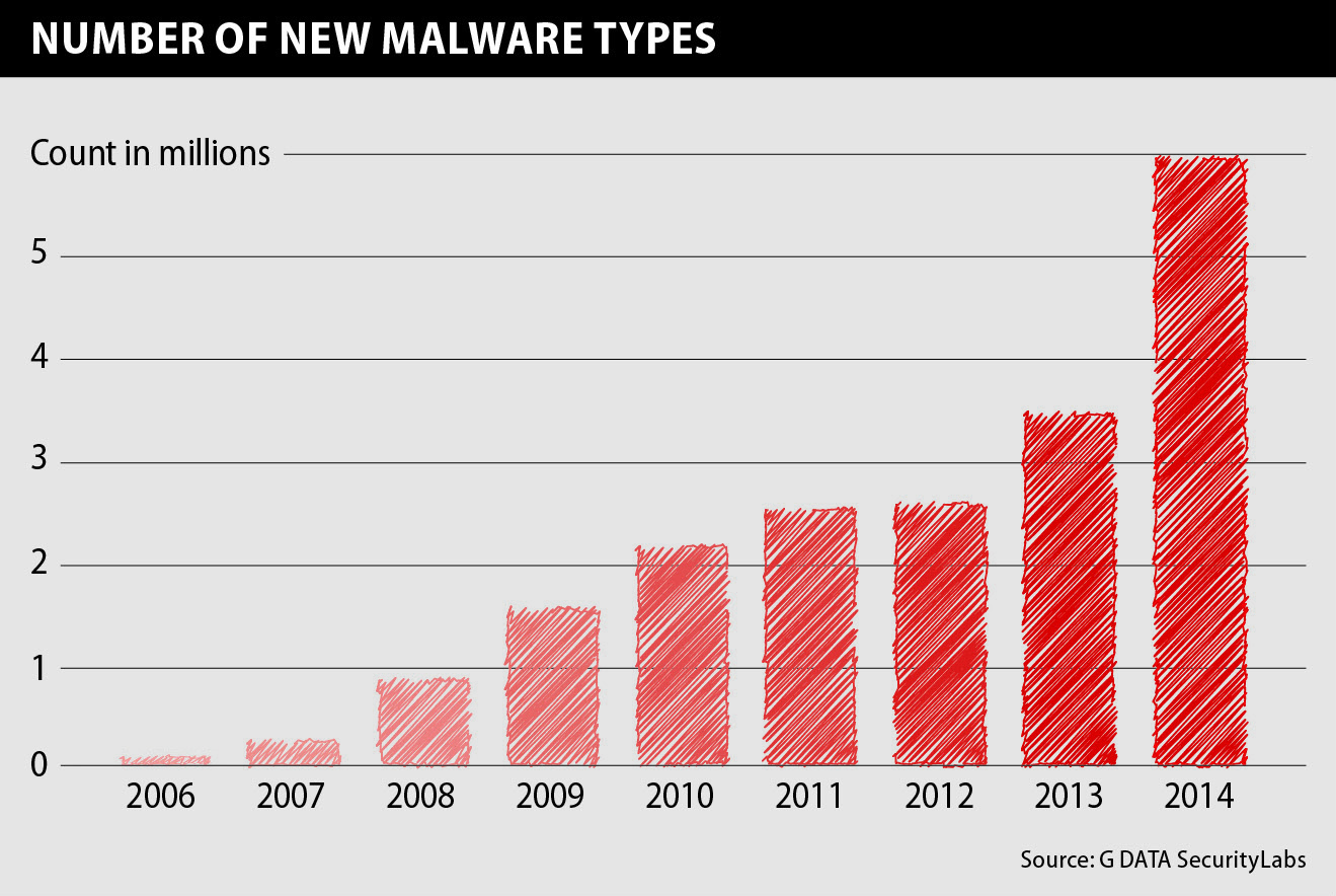 Expertii de securitate au descoperit 4,1 milioane de tulpini malware in a doua jumatate a anului 2014 - cu aproape 2,3 ori mai mare comparativ cu prima jumatate a anului. Pe intreg anul, G DATA SecurityLabs a inregistrat aproape sase milioane de noi variante de malware. Comparativ, in 2013 au fost doar 3,4 milioane de tulpini, dintre care 1,9 milioane au fost gasite in a doua jumatate a anului.