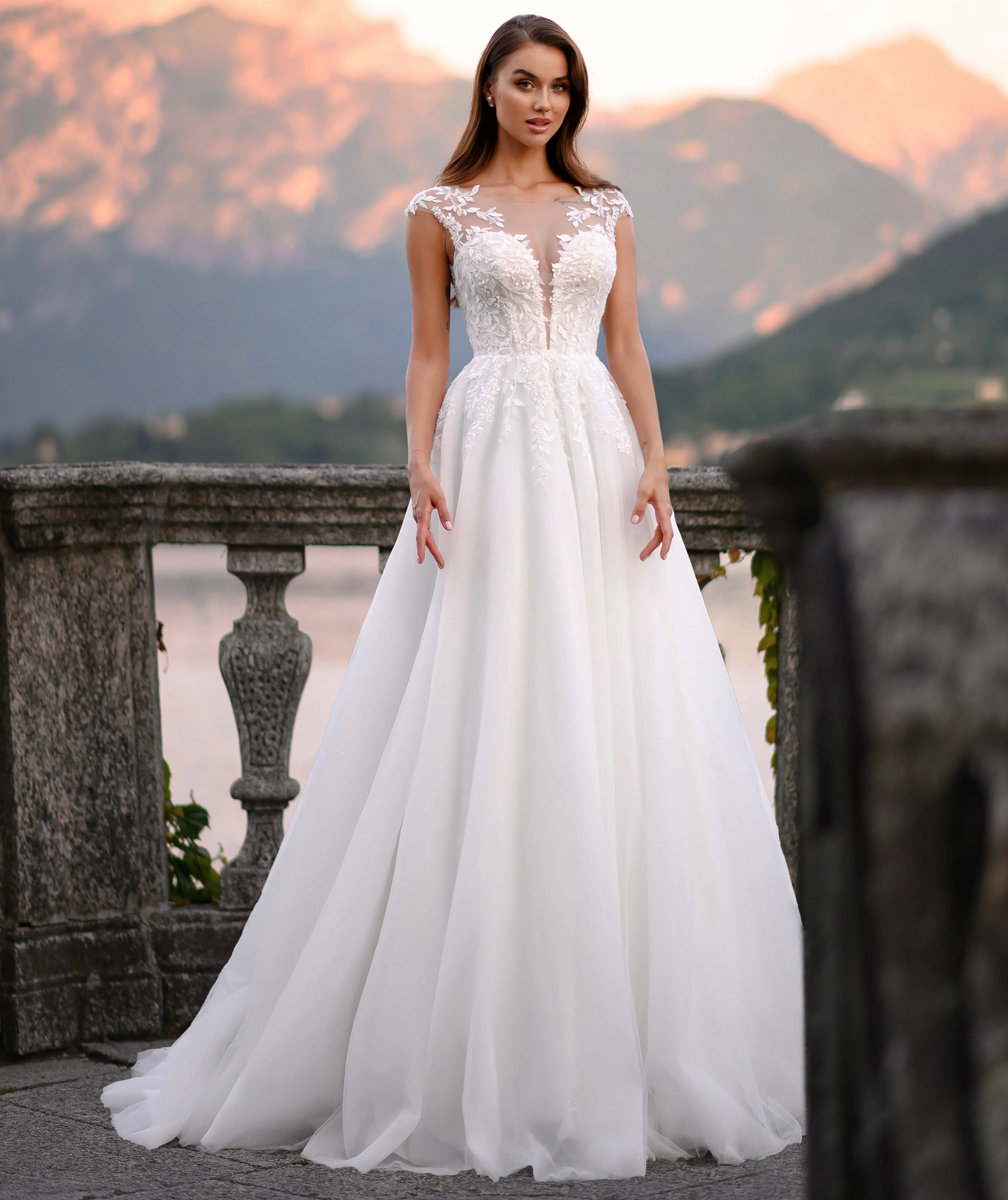 Decolteul: rochiile de mireasă cu un decolteu adânc sau cu un design strapless pot sublinia elegant liniile gâtului și a umerilor unei femei înalte, adăugând un element de rafinament și feminitate.