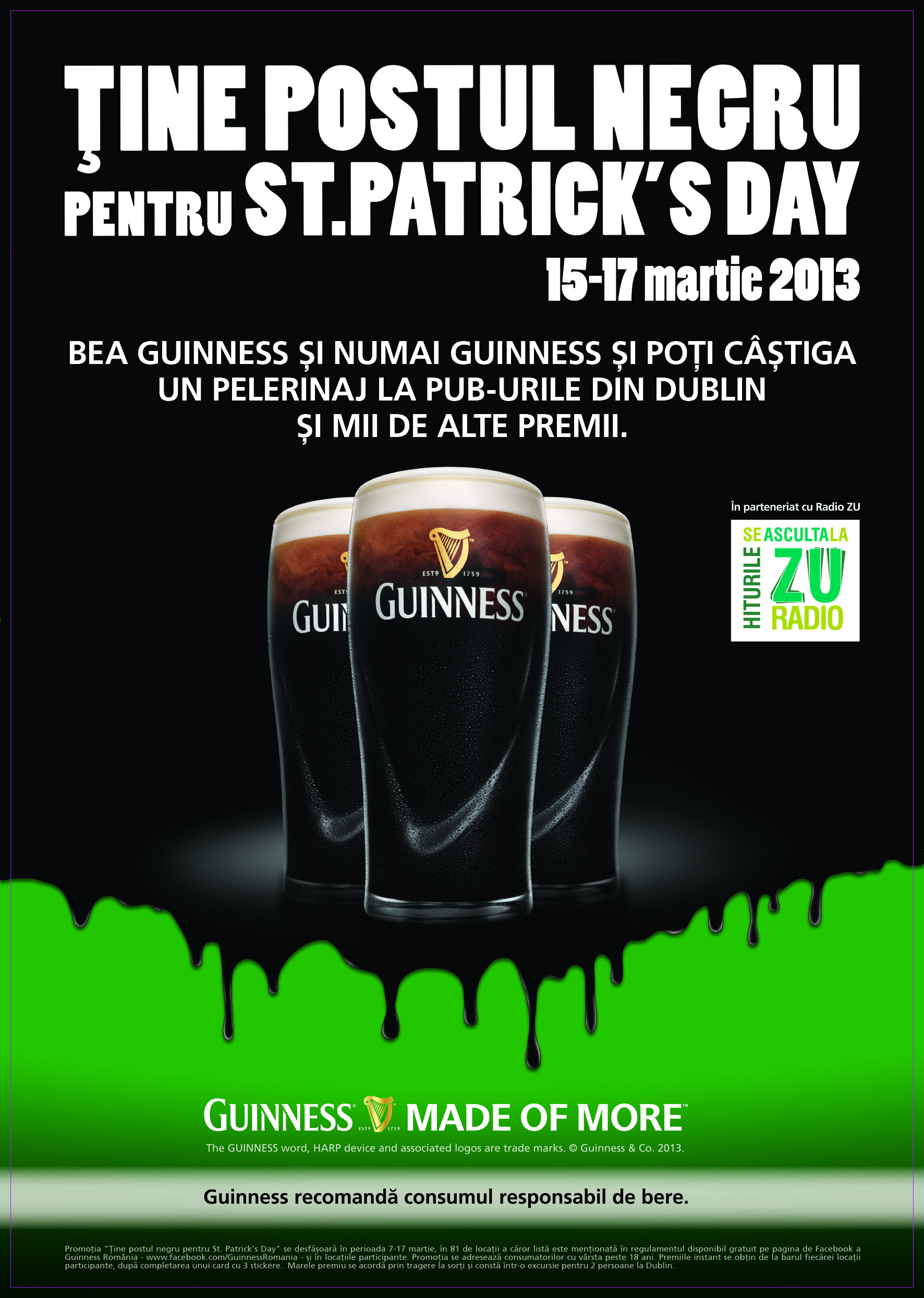 Conceptul „Paint the Town Black” este promovat în România prin decalogul „postului negru Guinness” – 10 reguli stricte pentru adevăratul consumator de Guinness. Astfel, cei care respectă decalogul şi beau minimum 3 pinturi de bere în perioada campaniei pot câştiga mii de premii instant sau, prin tragere la sorţi, un weekend pentru două persoane la Dublin, cu ocazia Arthur Guinness’ Day (septembrie 2013). Premiile pregătite de Guinness constau în pinturi de bere, CD-uri cu muzică irlandeză sau celebrele pălării Guinness.