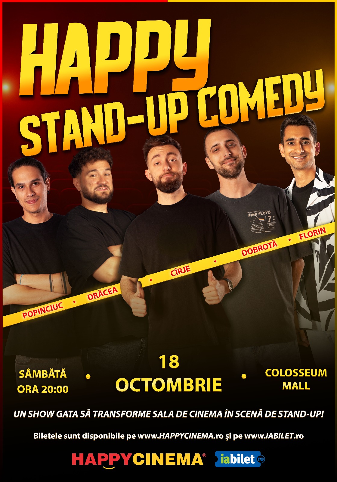 Pregătiți-vă pentru o seară de voie bună, glume, poante și improvizație, pentru că Happy Cinema Colosseum Mall devine, pe 18 octombrie, locul unde râsul e obligatoriu! De la ora 20:00, cinci dintre cei mai carismatici și spontani comedianți ai momentului urcă pe scenă pentru un spectacol live de neratat: